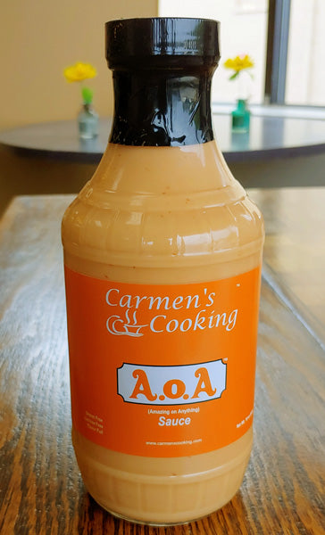 Our A.o.A (Amazing on Anything) Sauce is Carmen's version of a world renown recipe. Use as a marinade before grilling, as a slather sauce after you grill, or as a dipping sauce for fries, plantains, and more.